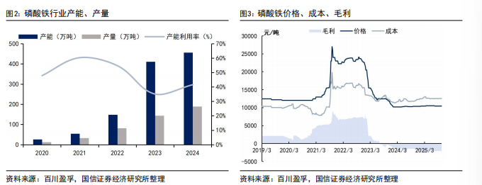磷酸铁需求明显回暖,景气度有望提升。据百川盈孚,截至2025年10月,国内磷酸铁行业产能达482万吨,2024年以来行业新增产能投放节奏明显放缓,但目前仍面临产能过剩问题,自2023年7月磷酸铁价格首次跌破成本线以来,磷酸铁生产的毛利润为负值已持续超两年。2020-2024年,中国磷酸铁行业经历爆发式扩张,产能从26.5万吨激增至455.8万吨,产量由12.7万吨跃升至189.4万吨,年均复合增速超95%,产能利用率在2023年一度降至35.1%的低位,反映阶段性产能过剩;但受益于磷酸铁锂电池在动力与储能领域的持续渗透,2024年需求明显回暖,产能利用率回升至41.5%。展望2025-2027年,尽管规划新增产能仍较多,但大量项目受制于磷矿资源审批、环评约束、资金压力及下游订单落地节奏,实际投产比例可能显著低于规划水平;叠加头部企业凭借“磷矿-净化磷酸-磷酸铁”一体化优势加速扩产,行业或存在名义产能虚高、有效供给集中的现象。预计2025年磷酸铁表观消费量增速或超过50%,整体产能利用率提升至57%左右。