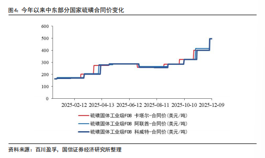 硫磺供需偏紧,地缘冲突加剧供给紧张。硫磺主要伴生于油气开采及炼化,未来油气消费增速下降,高硫原油生产有所下降,全球硫磺产量增速预期较低。硫磺最重要应用为制备硫酸,硫酸需求预计仍将保持中速增长,拉动硫磺需求增长,综合来看全球硫磺供需偏紧。俄罗斯本为全球第二大硫磺生产国,今年来其炼厂持续受袭,直接影响了气硫磺的生产和出口,加剧硫磺供应紧张。市场目前已经接受俄罗斯硫磺出口降低的现状,但随着冲突的持续进行,经俄罗斯出口的部分中亚国家生产硫磺供应有受阻风险。市场更加青睐供应稳定的中东硫磺,这进一步推高了中东硫磺价格。2025年初中东硫磺合同价为163-165美元/吨。近期中东多个国家分别上调了硫磺12月份官方合同价格至495美元/吨,折合人民币到岸价约4250元/吨左右。中东硫磺合同价环比上个月上涨80-95美元/吨,较年初上涨330-332美元/吨,实现了大幅上涨。