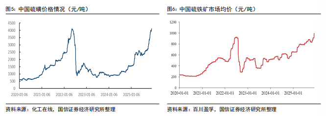 近期磷酸铁厂家纷纷提价,截止2025年12月19日,据百川盈孚,磷酸铁市场均价为10830元/吨,同比上涨3.14%;2025年12月19日,国内固态硫磺现货价为3950元/吨,同比去年上涨157.32%,硫铁矿市场均价为1024元/吨,同比去年上涨55.86%,硫铁矿制酸工艺优势明显。
