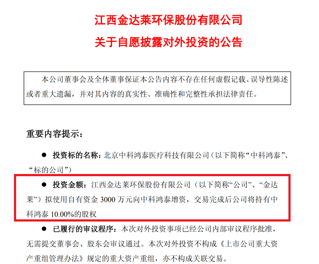 12月21日晚,金达莱宣布公司拟动用自有资金3000万元,向中科鸿泰进行增资,其中195.87万元用于认购新增注册资本,其余2804.13万元计入资本公积,交易完成后将持有中科鸿泰10%的股权。