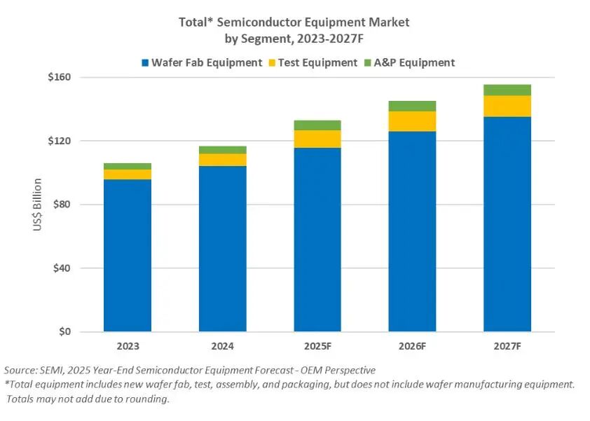 细分市场来看,SEMI指出,晶圆制造设备(WFE)领域去年创下1040亿美元的销售额纪录后,预计到2025年将增长11.0%,达到1157亿美元。