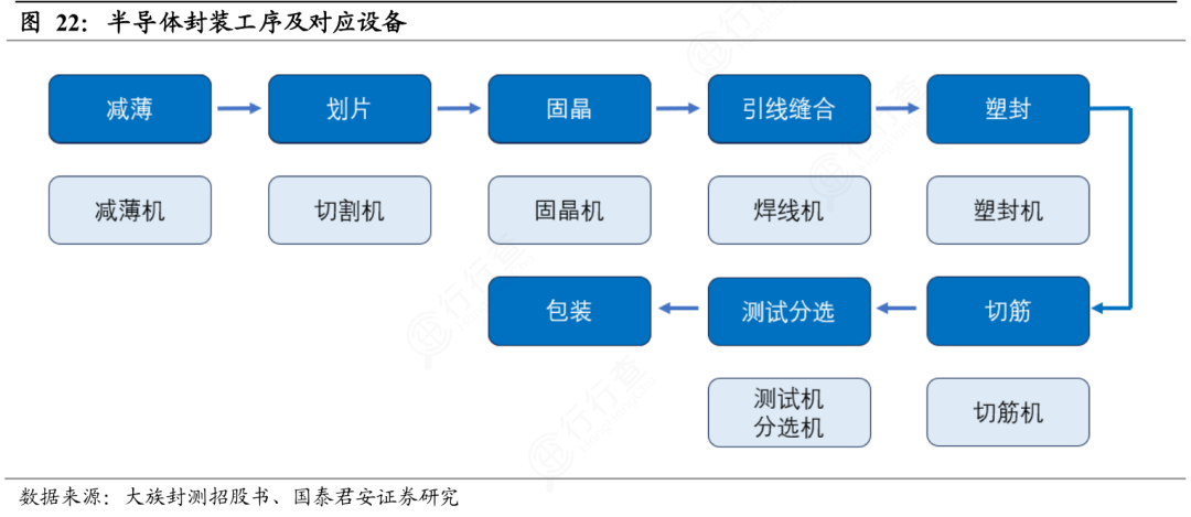 半导体封装设备包括晶圆减薄机、划片机、固晶机、引线键合机、封焊机和塑封机等关键设备。