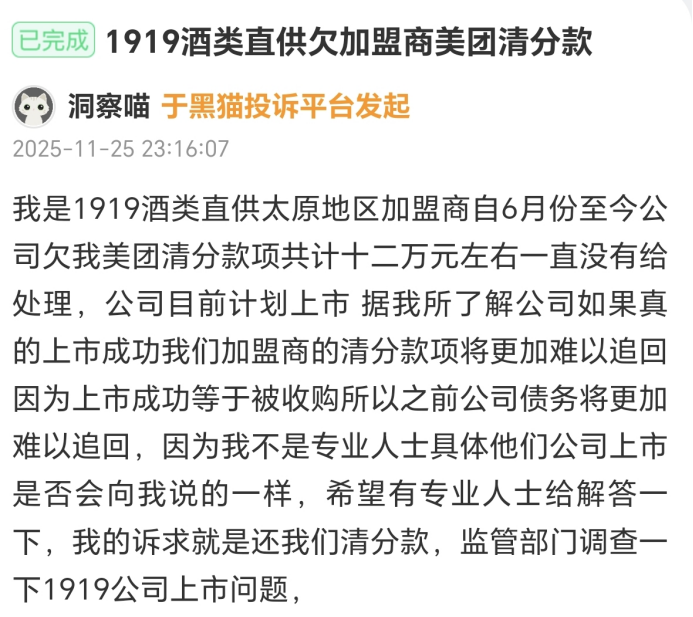 不过,大望财讯注意到,直至11月25日,黑猫投诉平台上仍有加盟商发布关于1919拖欠货款的投诉信息,“据我所了解公司如果真的上市成功,我们加盟商的款项将更加难以追回。”加盟商表示。