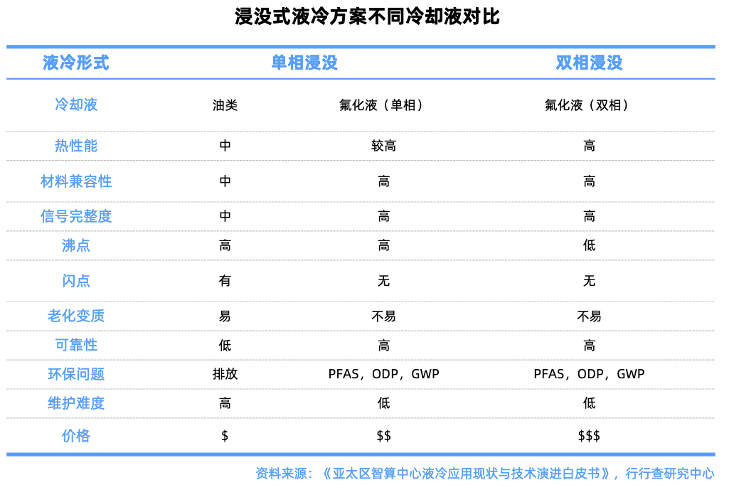 与冷板式液冷冷却液不同,运用在浸没式液冷冷却液直接包裹发热元件如CPU、GPU,通过热传导和对流直接带走热量,传热路径更短且效率更高,可以支持单机柜功率密度达100kW以上。
