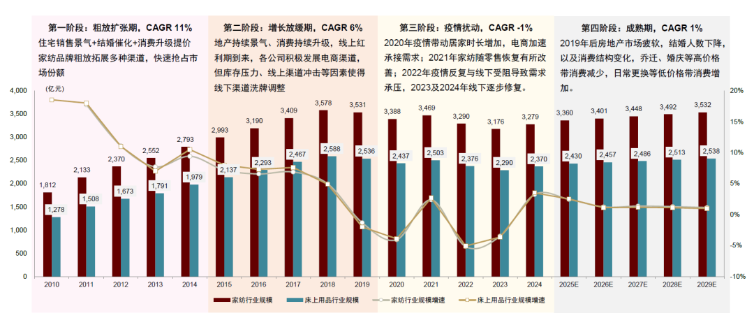 家纺行业空间广阔,疫情后延续平稳增长趋势。2024年我国家纺行业规模3,279亿元,其中床上用品规模占比约72%,达到2,370亿元。中国家纺行业经历了多个发展阶段,分别是粗放扩张期、增长放缓期、疫情扰动期和成熟期。其中地产、婚庆、消费升级等三大因素在早期驱动了较多增量升级需求,2015年渠道逐步分化,库存压力带动整体增速有所放缓,随着2019年后房地产市场疲软、结婚人数绝对值下降、消费力整体偏弱以及疫情冲击的影响,家纺行业进入了成熟期,消费需求主要受存量日常更换影响。根据Euromonitor预测,2025-2029年家纺行业规模将维持低单位数平稳增长趋势。