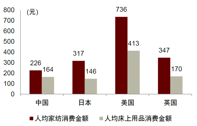 家纺在消费结构中地位稳固,但人均家纺消费水平仍有提升空间。在中国家庭的消费序列中,家纺属于耐用型消费品,从居民支出构成来看,家纺现金支出低于快消品、季节品,也低于家具、家电等耐用品,对比服装和鞋类,家纺支出仅为服装1/11和鞋类1/3左右。2024年中国家纺和床上用品人均消费分别为226元、164元,约为美国人均消费的1/3,较英国和日本也偏低,这主要是由于中国消费习惯中家纺产品使用周期长、更换频次低所致。随着人们消费观念的变化、健康意识的提升、对“悦己”和居家生活品质的日益重视,我们认为中国家纺市场有望逐步释放增长空间。