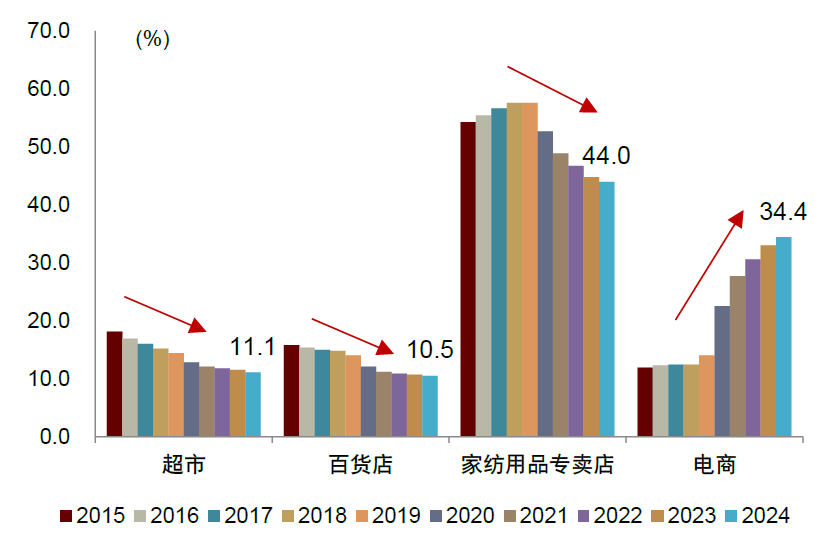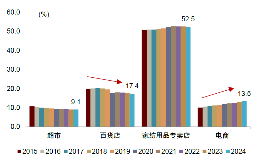 渠道结构持续调整,线上销售比例提升。2015-2019年期间,中国家纺用品销售以线下品牌专卖店为主,超市和百货店销售占比逐步下降,2019年专卖店销售占比提升至58%;2019年以后,疫情助推消费者线上消费,电商渠道销售占比快速提升,从2019年14%提升至2024年34%。这一期间,电商渠道在日本市场销售占比同样处于提升趋势。