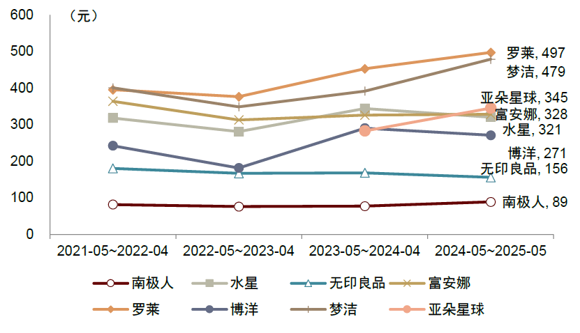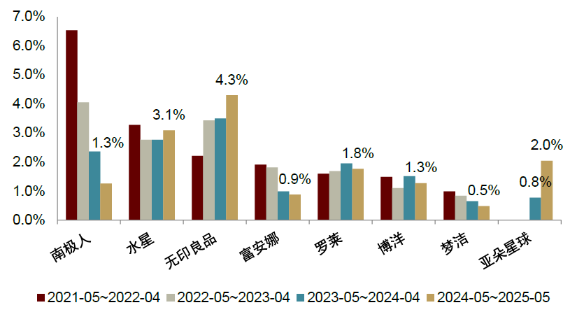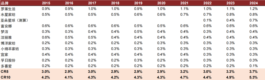 中国家纺行业集中度整体偏低,近十年提升缓慢。根据Euromonitor数据,2024年中国家纺行业CR5仅为3.7%,CR10仅为5.3%。其中罗莱生活从2015年市占率0.9%逐步提升至2024年1.2%,水星家纺从2015年0.5%逐步提升至0.8%。但我们看到亚朵星球近3年市占率提升较快,根据Euromonitor,从2022年亚朵星球市占率0.1%提升至2023年0.4%,再到2024年0.7%左右,跃升至市占率前三名。