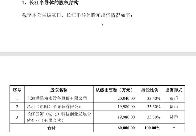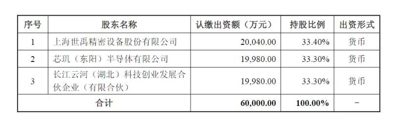 其股东包括:上海世禹精密设备股份有限公司(以下简称上海世禹)持股33.4%,芯玑(东阳)半导体有限公司(以下简称芯玑半导体)持股33.3%,长江云河(湖北)科技创业发展合伙企业(有限合伙)(以下简称长江云河)持股33.3%。