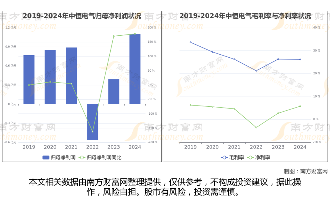 中恒电气财务数据显示(如上图): 2024年实现营业总收入 19.62亿,同比增长26.13%。近五年复合增长率(CAGR)为8.16%。