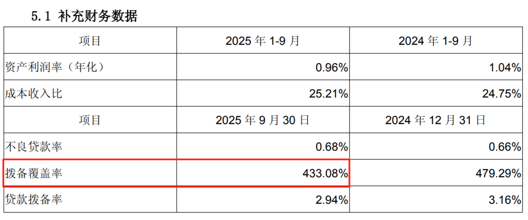为了掩盖业绩颓势,成都银行选择了 “降拨备换利润” 的权宜之计。三季度末,该行拨备覆盖率降至 433%,较去年底大幅下降 46 个百分点。