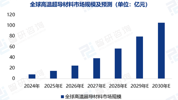 根据智研咨询的数据,2024年全球高温超导市场规模达到7.9亿元,同比增长77.3%;预计到2030年将突破百亿规模,达到105亿元,期间年复合增长率持续保持53.9%的强劲态势,成为新材料领域最具潜力的赛道之一。