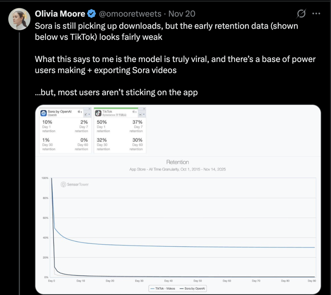 Sora app 60 天留存 0%|图片来源:X