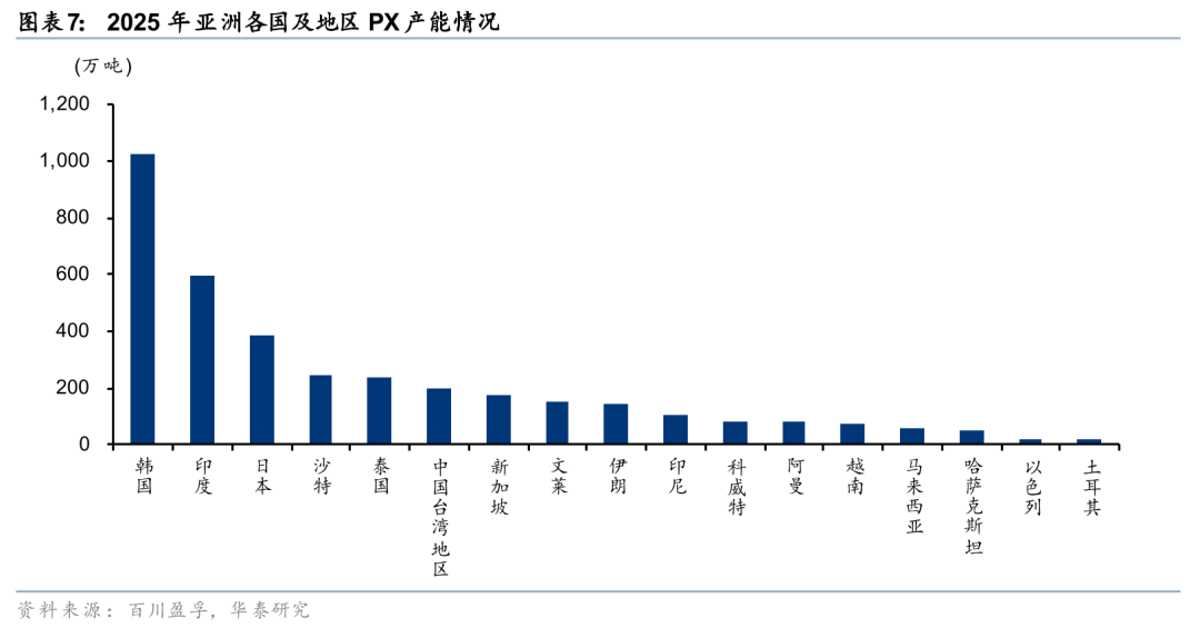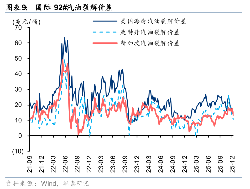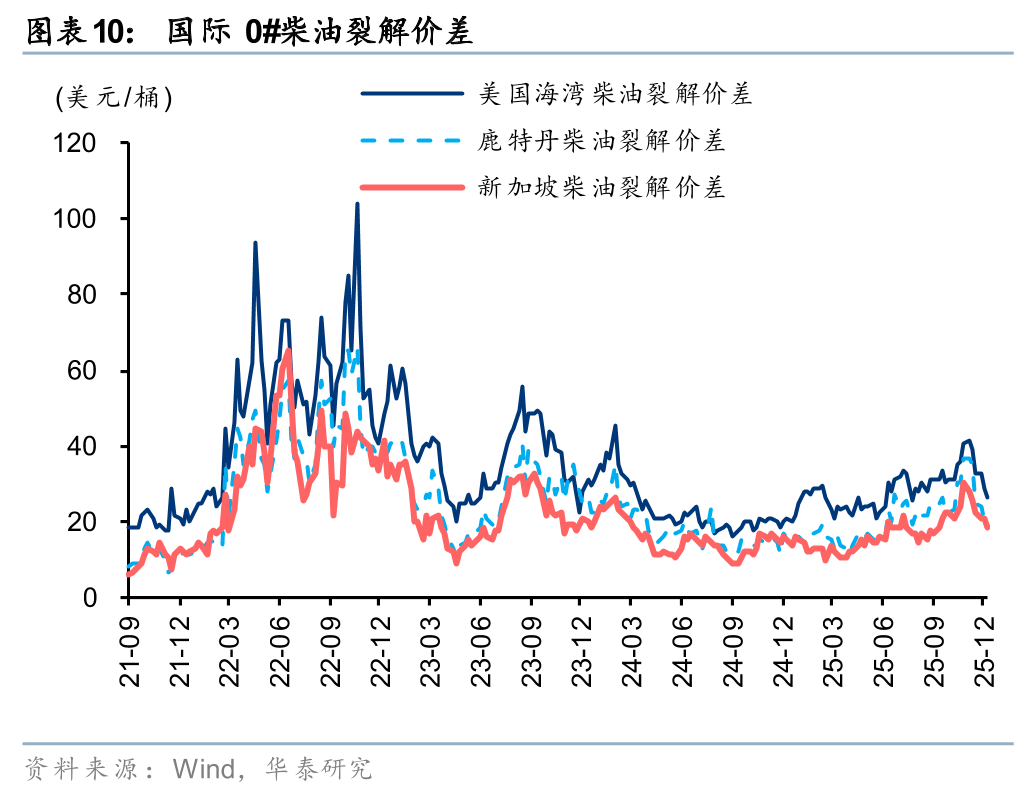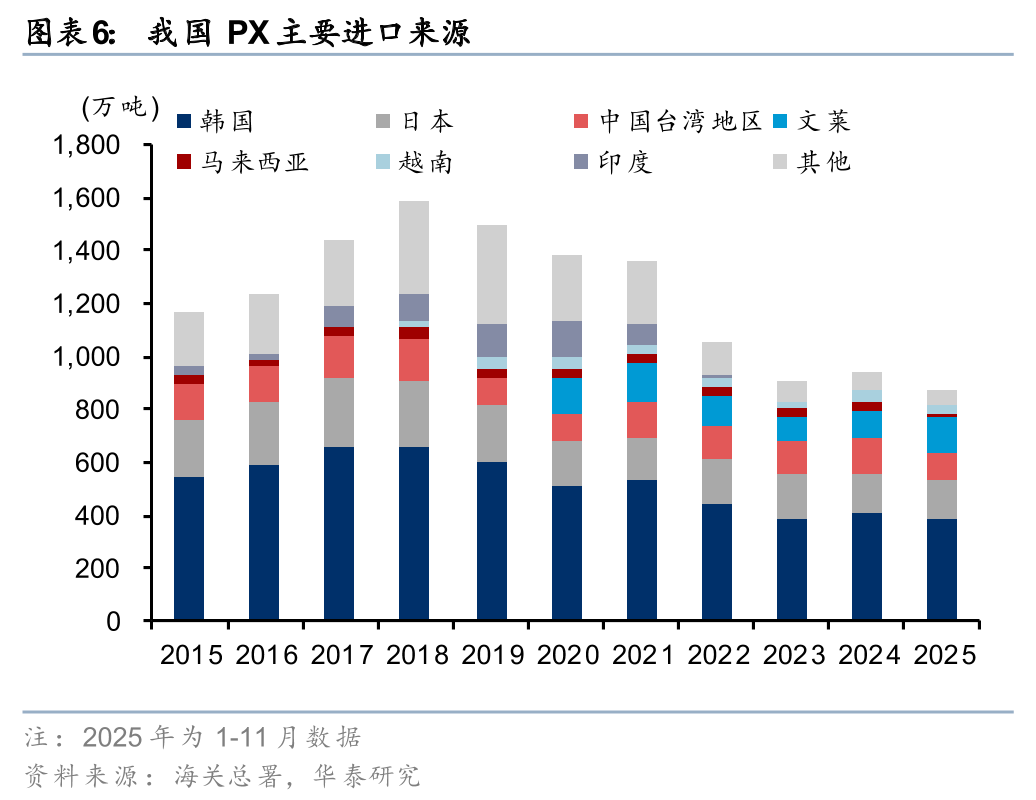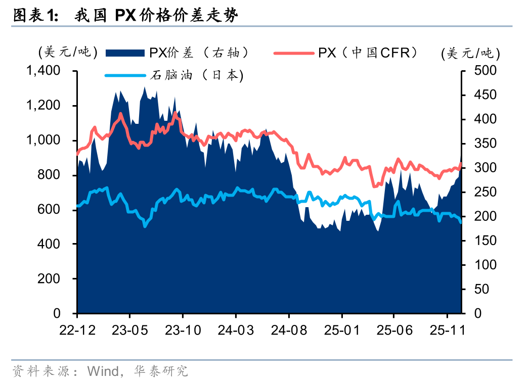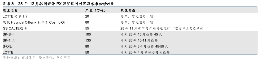全球PX产能主要集中在亚洲,24年东北亚及印度产能合计占全球约77%,其中中国占比超50%。韩国为全球第二大PX供应国,拥有产能超1000万吨,是我国第一大进口来源国,据海关总署,25年1-11月我国PX进口总量为867万吨,其中韩国/日本/文莱/中国台湾地区的进口量为385/145/130/108万吨。据百川盈孚,韩国GS CALTEX3号装置(55万吨)由于经济性因素于25年11月中下旬降负运行,并于12月中上旬停机,且该国明年仍有4套装置存检修计划。我们认为,美联储降息对全球宏观经济及出行的刺激作用或逐步显现,但乌克兰对俄罗斯炼厂的袭击,以及欧洲自26年1月1日起禁止进口俄油加工产品,或导致全球成品油出现供需缺口,带动汽柴油裂解价差提升,进而导致炼厂出于经济性考虑降低PX装置负荷。