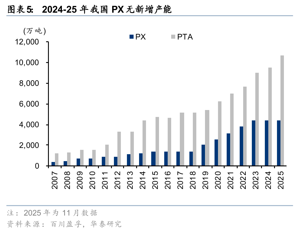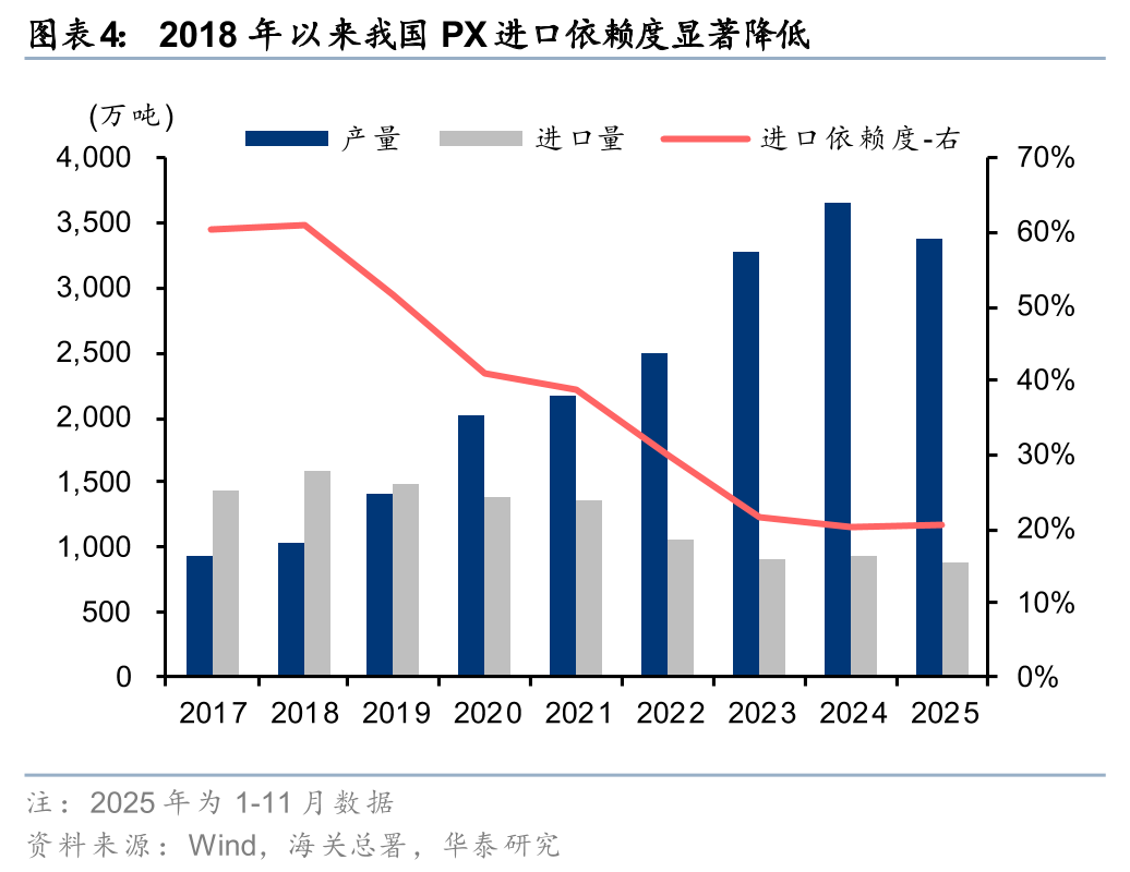 我国PX行业起步较晚,2000年以来伴随涤纶行业快速发展。2015-18年我国PX产能增长按下“暂停键”,直至19年民营大炼化集中投产,我国PX步入产能快速扩张阶段,24年末国内产能较18年增长220%至4422万吨,进口依赖度下降40pct至20%。25年国内PX无新增产能,而下游PTA新投产装置合计1180万吨,25Q2以来国内PX库存下滑至低位,同时PX-石脑油价差显著修复,12月22日国内PX价差较4月低点/9月末分别提升182/146美元/吨至351.8美元/吨。26年我国无明确新增产能,而下游PTA-聚酯产业链景气有望伴随宏观经济修复而回暖,叠加海外PX装置波动或致我国PX进口受限,预计国内PX或将维持紧平衡。