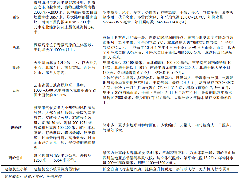 旅游场景是低空经济包括eVTOL类飞行器初期较好的落地场景,具有管控区域集中、需求韧性和匹配度高、盈利模型好、不可控因素相对其他场景较少等特征。考虑到旅游场景低空业态过往的演变,我们当前主要聚焦对于依托eVTOL设备的低空旅游市场规模进行测算。从中长期低空旅游可渗透的自然条件看,符合条件的景区类型主要包括自然山岳类、湖海江河类、草原沙漠、古镇周边或者城市当中对应的用于低空观光场景的规划空地等。