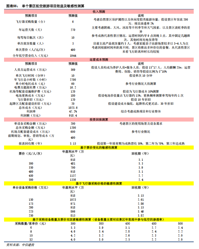 我们假设一个典型景区且符合低空旅游业态发展条件,主要采购eVTOL飞行器进行观光体验项目,测算其前期建设和采购投入成本、成熟状态收入和业绩贡献、回收期及部分假设敏感性等。若假设采购低空飞行器台数分别为6、8、10、12台,若全年运营天数、单台飞行器飞行次数、平均载客数量等假设不变,则全年对应到一个200万年客流的景区,低空旅游的游客渗透率分别约为2.4%、3.2%、4.1%、4.9%。