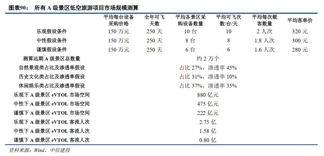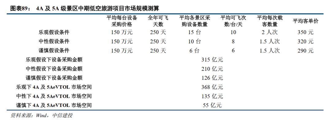 中性预期:假设各景区全年平均可飞天数为250天;假设各景区平均采购eVTOL设备数量为10台;假设各景区平均每台设备每日可飞次数为8次,平均每次载客数量为1.5人次;假设各景区低空旅游业态在培育成熟后盈利模型和成本结构相似;假设规模化生产后eVTOL设备采购单价约150万元;假设单次运营客单价约320元;则可计算出4A及5A级景区低空项目渗透后所产生的eVTOL设备采购总支出约为210亿元。按照如上经营数据假设,则4A及5A级景区eVTOL业态培育成熟后年营业收入约为135亿元。
