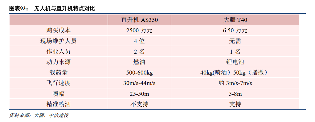 无人机和直升机在农业植保领域有着不同的应用场景。直升机具有速度快、喷幅范围广、载药量高和动力充沛等特点,适合大规模、地区性工作。无人机具有成本低、人力支出低、能够精准施肥等特点,适合个人式、精细式工作。