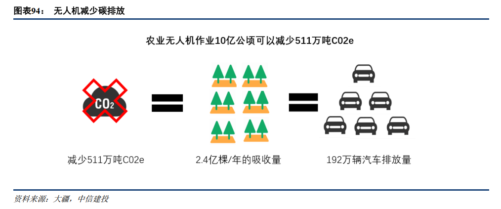 和地面设备如拖拉机等传统农机对比,农业无人机能够显著减少碳排放、减少用水量以及提高用药效率。每10亿公顷无人机作业可以减少511万吨二氧化碳当量排放、4400万吨农业用水以及1515吨农药浪费。