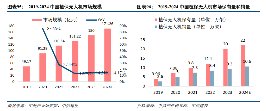 据中商产业研究院数据,农用植保无人机的市场规模持续增长,2023年市场规模达到150亿元,同比增长14.3%。2019-2023年,我国植保无人机的市场销量不断增长,植保无人机保有量由2019年的3.96万架增长至2023年的20万架,市场接受度不断提高。
