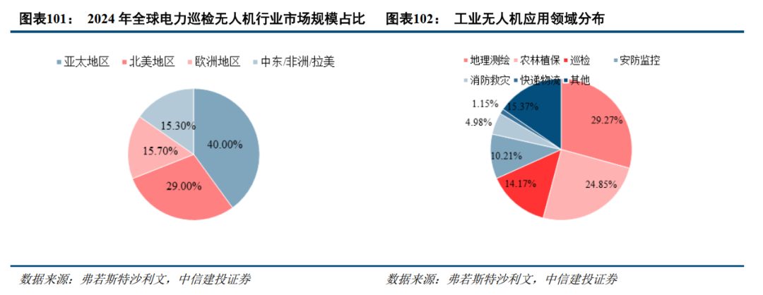 低空巡检服务市场规模不断扩大。据统计,2024年全球低空巡检市场规模达273.9亿美元,较2023年增长22.47%,其中电力巡检占比最高达到35.6%,交通基建28.3%、新能源19.2%紧随其后。中国作为核心增长极,凭借政策支持与基建规模优势,市场规模达320亿元人民币,其中电力巡检占比45%。交通巡检占比28%,能源与林业巡检合计占比27%。电力巡检细分领域尤为突出,2024年全球电力巡检无人机行业市场规模达234亿元人民币,亚太地区占比超40%。中国通过国家电网、南方电网等龙头企业推动技术落地,2024年电力巡检无人机市场规模达到68.31亿元人民币,国家电网计划三年内实现输电线路无人机巡检全覆盖,推动全行业进入“智能运维”时代。据中国信通院预计,到2030年低空经济整体规模将达到2万亿元,其中应用产业占比75.3%。巡检作为核心场景之一,市场规模有望突破1200亿元,年均复合增长率超20%。全球市场层面,博瑞产业研究院数据显示,2032年全球低空巡检需求规模将达到985.7亿美元,较2025年扩大2.94倍,年复合增长16.65%,中国仍将是全球市场的增长主力。