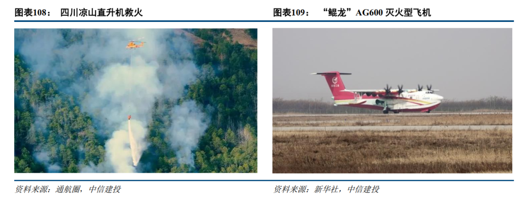 对于森林火灾和城市高密度地区火灾而言,消防直升机能够通过空中交通高效运输如灭火剂、水源、应急药品、食品等物资,有效避免因森林地势复杂或城市交通拥挤所带来的时间延误。2020年四川凉山西昌森林火灾中,共出动4架直升机,飞行时长10小时10分钟,洒水74桶,超过290吨。2025年2月,中国航空工业集团有限公司研制的大型灭火/水上救援水陆两栖飞机AG600代号“鲲龙”已完成所有取证试飞科目,标志着我国自研的一大进步。无人机能够保持对火源的监控,帮助制定疏散计划、执行救援任务,通过无人机搭建的监测平台可以和应急救援平台联通共享信息,实现自动化侦测消防隐患,及时执行救援方案。