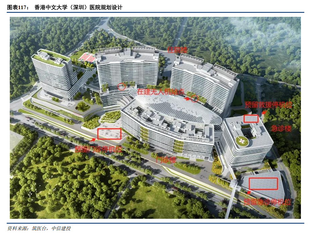 目前,部分新型医院建设已将未来各种低空飞行器在医院应用的需求纳入规划方案。以香港中文大学(深圳)医院为例,其楼顶规划建设标准的应急救援直升机停机坪;急诊急救科前方规划室外无遮挡区域,可以转换成为急诊急救低空飞行器的起降空间和停机位空间,住院医技楼裙楼屋顶规划建设一个无人机物流停机坪站点,并且与中型箱式物流系统无缝对接。