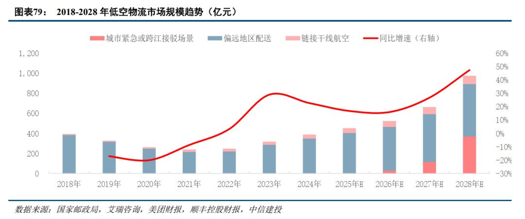 低空物流市场前景广阔,2024年低空物流市场规模约为385亿元,2025年市场规模预计达到450亿元,同比增长17%。三大低空物流应用场景中,偏远地区配送是最核心的刚性需求,稳定在300亿-500亿元规模市场需求(日均约100万单)。未来三年,低空物流市场规模有望持续扩大,成为物流行业的重要组成部分。预计到2028年将迫近1000亿元,年复合增长率超过25%。其中,围绕同城快递和即时配送的紧急或跨江等接驳场景将是重要增长极。