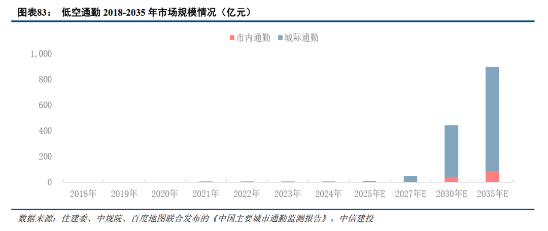 根据住建部报告数据,北京、上海等城市45分钟以上通勤时间的人口占比达25%左右,若采用eVTOL(时速200-300公里),30公里内通勤时间可缩短至10分钟,到2035年理论上市内通勤的市场规模达百亿元,城际间通勤需求规模可达800亿以上。