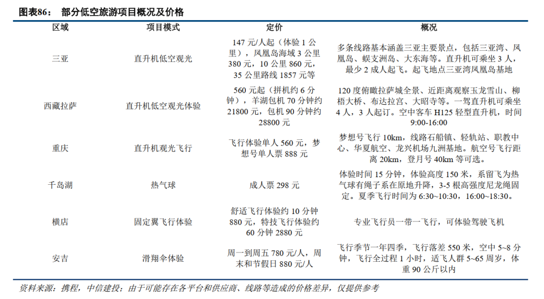 低空经济与旅游业态的结合在国内已有较多实践案例可参考。海南凭借优质的自然资源和地理环境,已有较为成熟的低空旅游业态布局,且过往每年承载的低空旅游人数在国内整体市场中占比较大。从海南地区自然条件看,全年经常超过300天的可飞天气,且低空空域使用管理相对顺利,行业协会积极发挥政府与行业的沟通桥梁作用,加速了低空项目向旅游体验类、体育类转型的过程。携程平台2023年海南低空旅游产品订单量同比提升超50%,销售额翻倍。三亚海棠湾、凤凰岛、三亚湾等直升机基地,以及博鳌、陵水等滑翔伞基地等低空旅游产品成为旅游市场的热门。根据南国都市报报道,以某航空旅游公司直升机为例,可续航超600公里,空中体验5~20分钟,价格约398元/人。万宁石梅湾一带低空旅游年均接待量在1万至2万人左右。海南省航空运动协会秘书长介绍,纳入海南省航空运动协会数据统计的运营企业有十多家,项目分布在三亚、陵水、琼海、儋州、万宁、乐东等地,涵盖直升机观光、热气球、滑翔伞、跳伞、动力伞、动力三角翼、运动飞机培训、无人机竞速等产品,人均体验价格在800元至6800元之间。