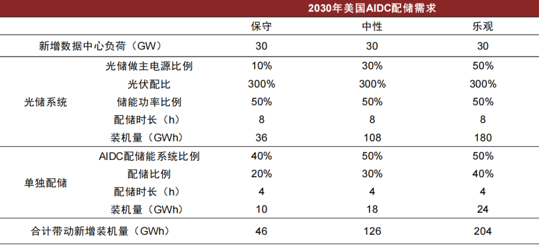 预计2030年美国AIDC配储需求或达100-200GWh。根据储能在AIDC中发挥的作用,我们划分两类AIDC配储需求。1)光储作为AIDC基础电力供应,在该方案下,光伏配比假设300%、储能功率配比50%,配储时长8小时,保守/中性/乐观情形下该方案渗透率分别为10%/30%/50%,则测算得储能需求量分别约36/108/180GWh。2)储能作为灵活性资源加快AIDC并网速度,该方案下,参考目前项目的配置情况,储能功率配比普遍在20%-50%,4小时,我们假设三种情形下2030年该方案渗透率40%/50%/50%,则测算得储能需求量分别约10/18/24GWh。