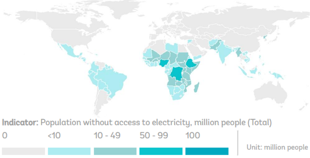 图表:世界各国缺乏电力供应的人口数量(2023年)