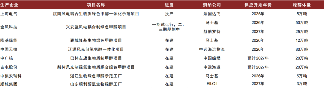绿醇采购协议保障绿醇消纳,产能落地带动甲醇销量逐步增长。2025年7月,上海电气洮南绿色甲醇项目投产,首期年产能5万吨,将经由上港集团为法国达飞船舶供应绿醇,成为国内首个规模化商业运行的绿色甲醇项目。金风科技、隆基绿能等已与马士基、赫伯罗特等国际航运巨头签署大规模绿醇长期采购协议,相关产能处于试运行或在建状态,我们预计2026年起将快速放量。