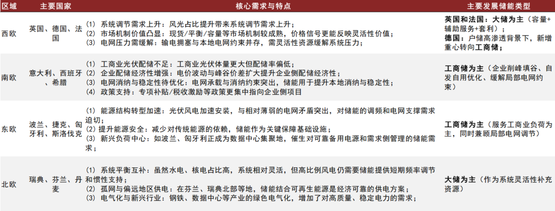 1) 大储:英国、爱尔兰及北欧国家(瑞典、芬兰等)成熟的电力市场与高比例可再生能源系统,催生了对调频、备用容量及跨区平衡等电网级服务的需求,因此增长由大储主导。