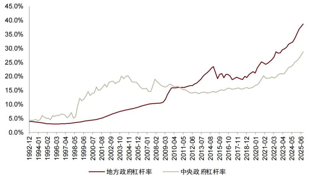 我们认为“中央加杠杆、地方去杠杆”的趋势仍将持续。2025年12月中央经济工作会议还提出要适当增加中央预算内投资规模,优化实施“两重”项目[3],结合当前中央与地方财政赤字率来看,我们预计2026年中央加杠杆、地方降杠杆的趋势或将延续。一方面,在地方政府债务率持续提升、债务风险不断积累的背景下,地方政府加杠杆的能力有限。另一方面,中央财政还有较大的举债空间和赤字提升空间,自2011年地方政府杠杆率首次超过中央以来,我国中央财政一直保持了相对较低的杠杆规模(政府债务/名义GDP),截至2025年9月,我国地方政府和中央政府的杠杆率分别为38.7%、28.8%。因而我们判断未来投资任务将更多地由中央政府主导。