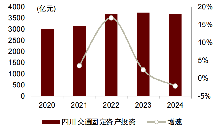 2)从投资维度看,四川交通投资持续领跑全国。四川交通投资额占全国比重较高,近年呈上升趋势,1-3Q25四川省交通投资占全国比重9.9%,且四川省交通投资增速快于全国平均水平,2020-2024年复合增长率为4.9%,同期全国增速2.2%;2024年四川交通投资有所承压,我们判断主要和2023年8月山洪事件对省内基建投资主体蜀道集团的影响有关,但降幅仍然好于全国。2025年四川基建投资重回正轨,1-3Q25交通投资同比 1.1%,同期全国增速为-5.4%。