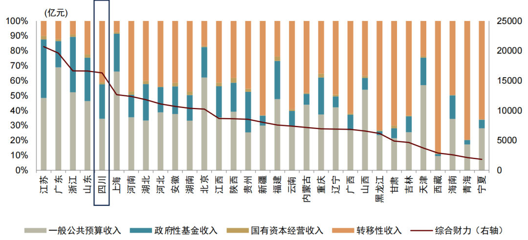 3)从财政维度看,2024年四川省综合财力排名全国第五,区域内资金保障较为充裕。2024年,我们计算的四川省综合财力为1.7万亿元,排名全国第五,债务率为125.7%,排名全国倒数第五。拆分来看,四川省接收中央转移支付的金额达6715亿元,为全国之最,占综合财力的比例达41.2%。四川省长期在中央转移支付中名列前茅,也进一步体现了政策对四川省发展的支持。