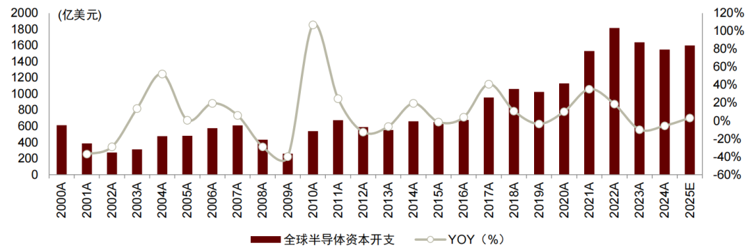 半导体行业的资本开支呈现出3-4年的周期性变化,我们判断未来2-3年可能迎来新一轮半导体资本开支的景气度回升。纵观近二十年,半导体行业资本开支整体保持增长态势,但呈现出3-4年的周期性波动特征。我们认为主要由于半导体项目本身的投资规模较大,且建设周期较长,晶圆工厂从规划到落地一般需要2-3年时间,因此半导体产能释放具有一定滞后性,企业在行业需求旺盛阶段往往密集投资,而新增产能陆续释放后,则可能导致供需错配。近年来行业资本开支于2022年达到顶峰的1817亿美元,随后逐步回落,据IC Insights预计,2025年全球半导体行业资本支出有望达到1600亿美元,同比增长3%。