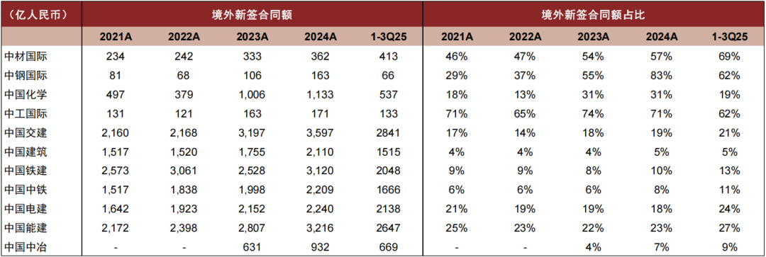 图表20:主要建筑央企、国际工程企业境外新签合同额情况