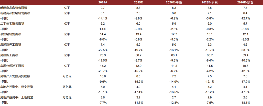 地产:数据还在持续筑底。2025年1-11月,房地产开发投资同比-15.9%,商品房销售面积同比-7.8%,房屋新开工、施工、竣工面积同比分别-20.5%,-9.6%、-18.0%,数据层面还未看到回稳或触底反弹的拐点,中金地产团队预期,2026年新建商品住宅销售面积降幅有望收窄,2026年乐观、中性、悲观三种情景下房地产投资分别下跌12.1%、14.9%和17.9%。我们认为2026年房建企业的压力仍存,或进一步寻求业务结构多元化。