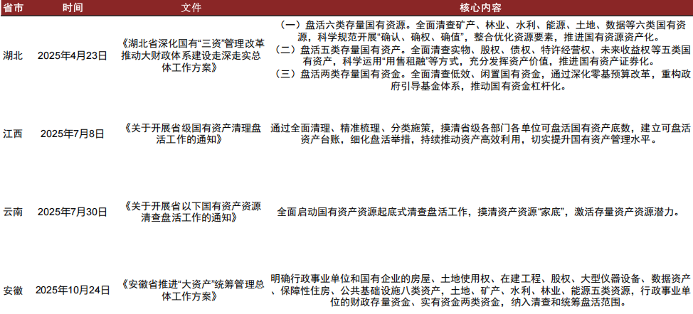 各地三资改革推进如火如荼,有望在化债、增加地方财政收入方面发挥积极作用。“三资”指国有资源、国有资产、国有资金;“三化”指的是国有资源资产化、国有资产证券化、国有资金杠杆化。三资改革,旨在通过市场化手段将其转化为可增值可流动、可放大的资本,核心是变“静态存量”为“动态增量”,我们认为三资改革是各个省份基于资源禀赋和经济发展的不同需求而探索出的多样化盘活路径,在化解地方政府隐性负债、破解土地财政困境方面具备重要的作用。