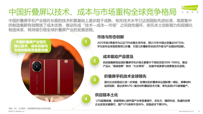 在折叠屏手机硬件发展方面,尤其是核心的铰链与屏幕技术,实现从满足基本功能到追求综合体验的转型,硬件创新从单点突破走向系统工程,推动折叠屏产品摆脱“尝鲜”标签,向可靠、好用且无负担的“主力机”地位加速迈进。