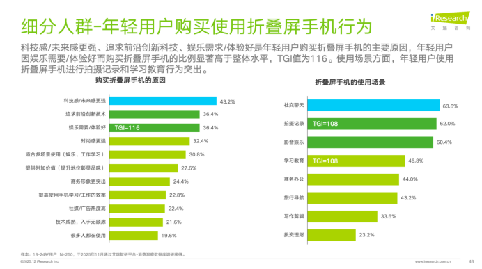 《报告》显示,年轻用户购买折叠屏手机的主要原因,包括科技感/未来感更强、追求前沿创新科技、娱乐需求/体验好。年轻用户因“娱乐需要/体验好”而购买折叠屏手机的比例,显著高于整体水平。此外,年轻用户也喜欢使用折叠屏手机进行拍摄记录和学习教育。