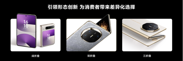 相较其他品牌,华为是唯一完整覆盖小折叠、大折叠、阔折叠及三折叠形态,完成全形态布局的厂商,差异化明显,技术路线上处于领先地位。