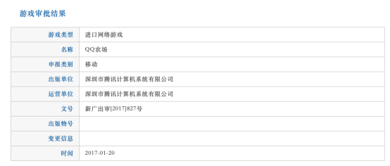 国家新闻出版署网站查询信息显示,腾讯旗下的《QQ农场》早在2010年便取得版号,其移动版本也在2017年获得版号。