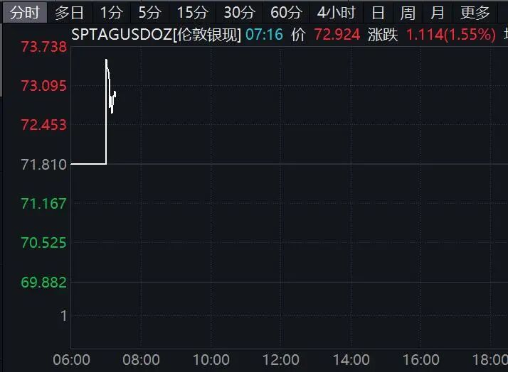 现货白银跳空高开,一度突破73美元/盎司,再创历史新高,盘中涨幅扩大至2%。现货钯金涨超2%。