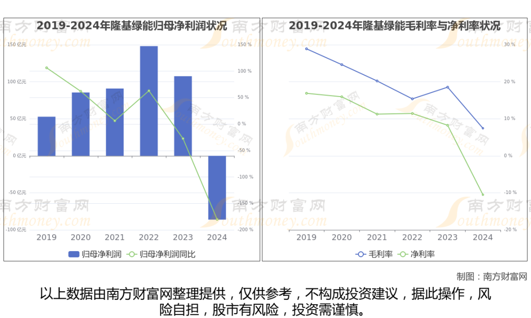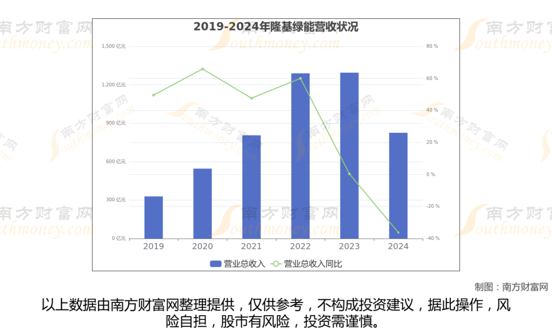 隆基绿能2024年数据显示(如上图),公司2024年营业收入825.82亿,同比增长-36.23%,近五年复合年增长率10.91%。