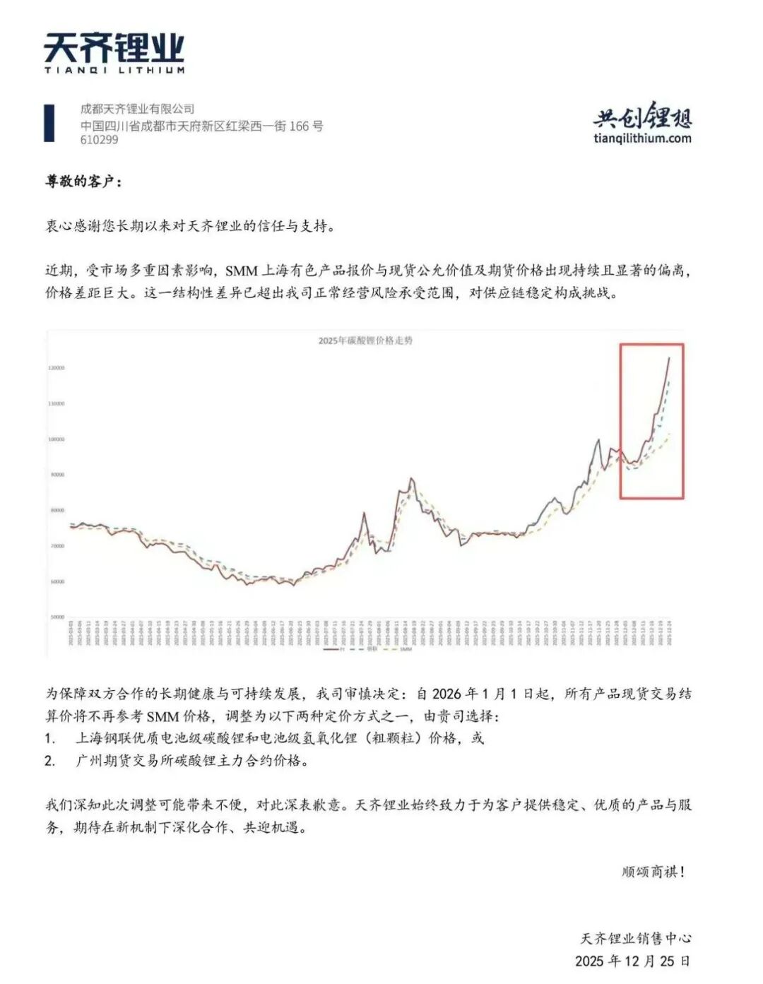 12月26日,锂电市场热潮正盛,碳酸锂价格眼看就要突破13万元/吨关口,创下2023年11月以来的新高。就在市场沉浸在这份狂欢氛围中时,锂业巨头天齐锂业抛出一枚重磅公告,恰似烈火烹油,瞬间聚焦了全行业的目光——一场关乎碳酸锂行业定价体系的变革,就此拉开序幕。