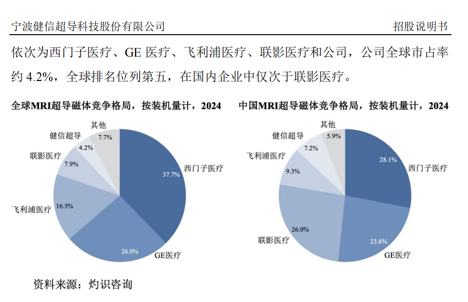 健信超导作为医用磁共振成像(MRI)设备核心部件领域的领军企业,2024年公司超导磁体全球市占率位列第五、国内企业第二,成为全球最大的独立超导磁体供应商,其产品覆盖GE医疗、飞利浦医疗、联影医疗等知名设备厂商。